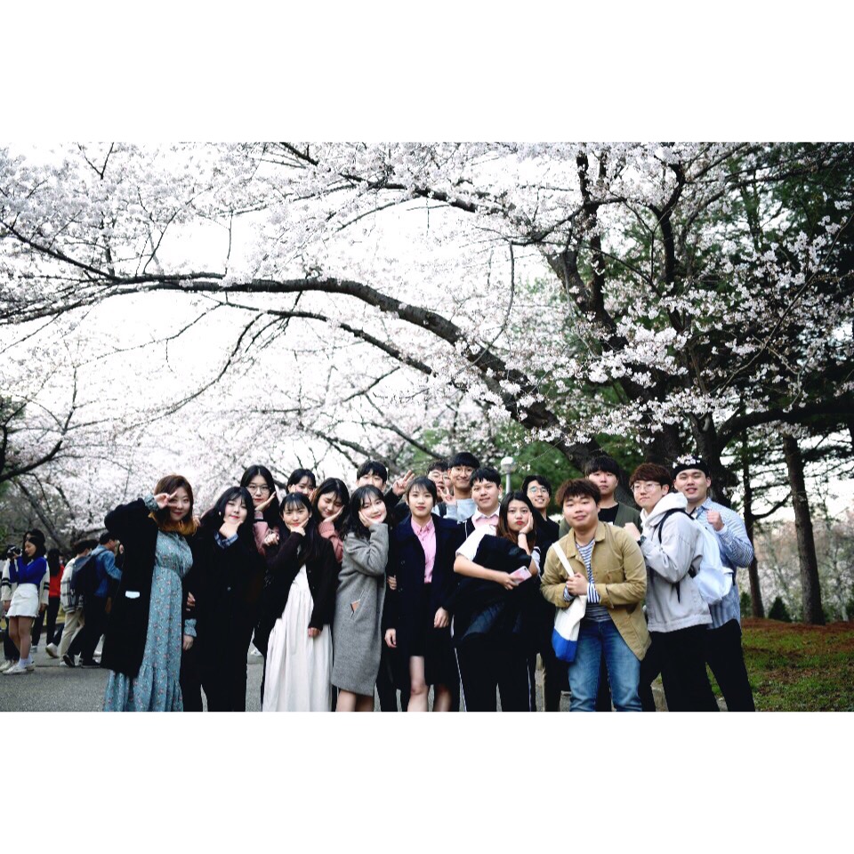 冬天过去春天到来,韩国的春天是充满着生机的。早前光秃秃的树,下雨后,一夜之间仿佛突然发芽,第二天出去你会看到绿油油的一片。说到韩国的春天就不得不说樱花了。在樱花盛开的季节,我们学校也举办了樱花节。樱花路上有很多人在拍照,看到了各种各样有趣的姿势,让人感觉青春真的很美好。樱花路的旁边有一片草地,那里有公演,旁边有很多人直接在地上铺着布野餐,学生会也布置了很多可以聚餐的桌子椅子,旁边的小路上有很多卖各种小吃的小摊子,还在限定时间内提供免费的鸡尾酒。公演氛围很好,大家聚在一起一边听歌一边喝酒玩游戏,留下美好的回忆。还有的同学趁着樱花季,借着课程小组活动的机会去韩国首尔去亲身体验了韩国的历史文化。他们到了建成之后遭受3次烧毁,8次重建的普信阁。还去了三一运动的发起地,号称韩国最早的公园,塔谷公园。