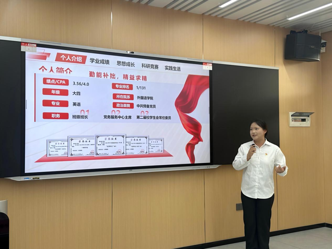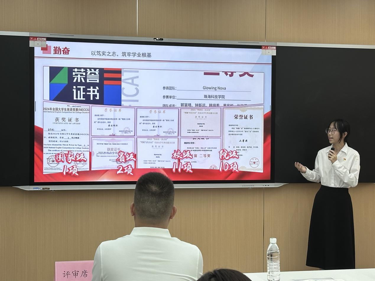 展示环节中,英语专业的刘文佳、潘慧欣、刘丽群同学,商务英语专业的黄家悦同学按抽签顺序进行答辩展示,以PPT汇报结合现场阐述的形式,全面展现个人综合实力。她们在学业、科研、实践领域的亮眼成绩,完美诠释了“外语见长、全面发展”的外院学风。