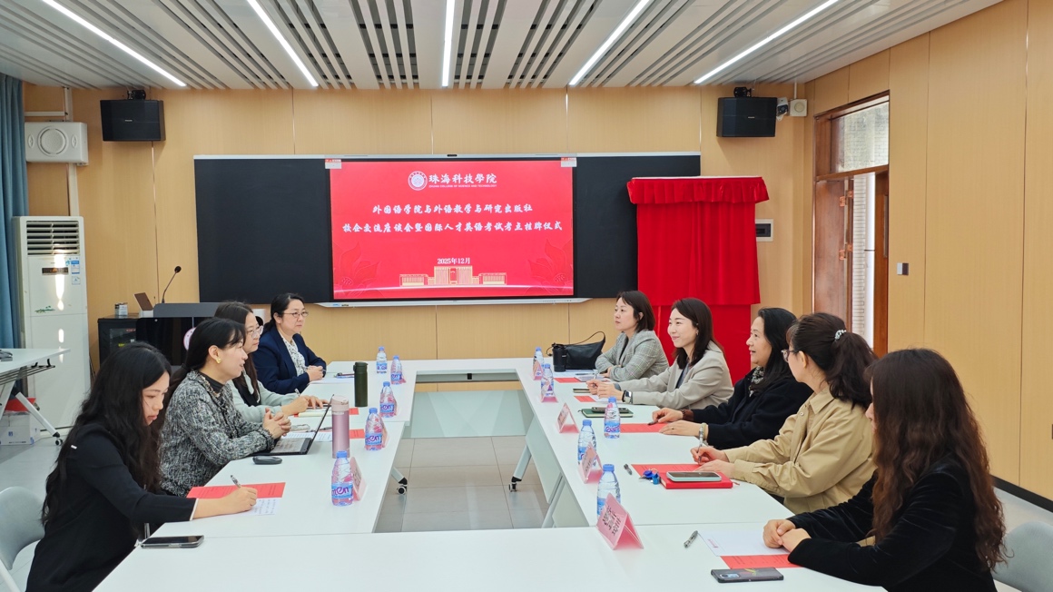致辞结束后,外语教学与研究出版社国际人才发展中心总经理冯涛、学校教育合作发展中心主任梁明玉、外国语学院院长王晶共同为国才考试考点揭牌。接着,双方围绕毕业生就业输送、产教融合、数字教材开发等议题,展开了深入交流探讨。